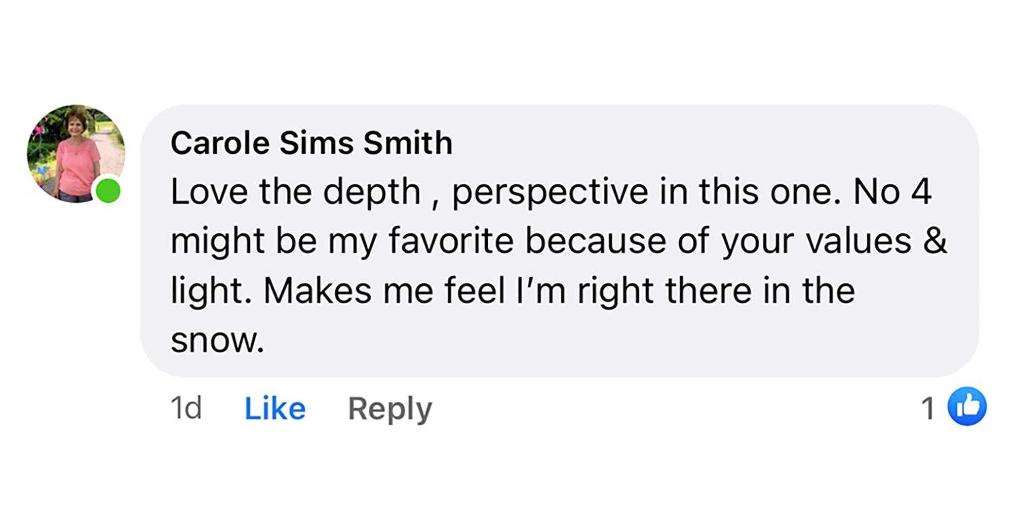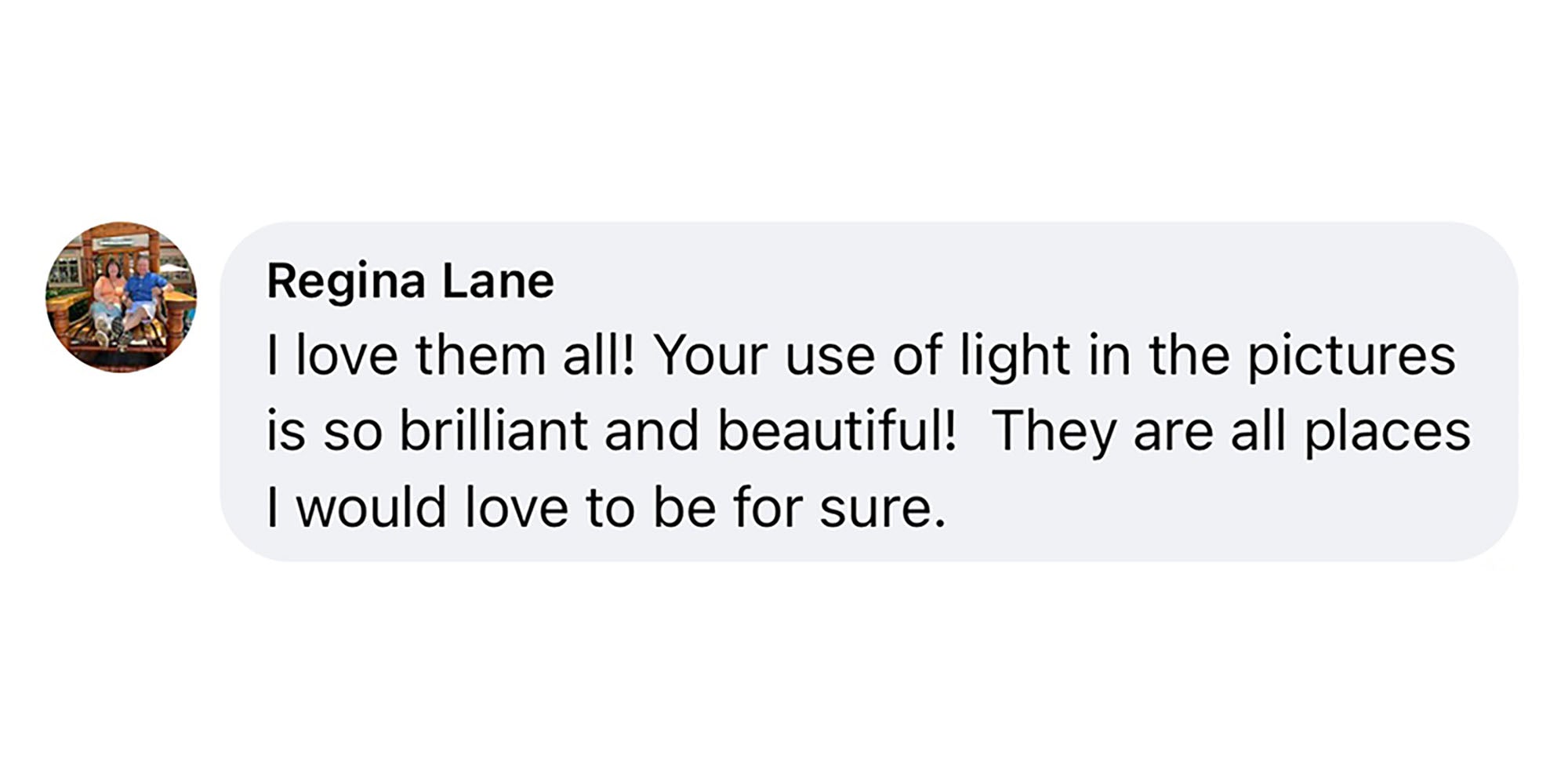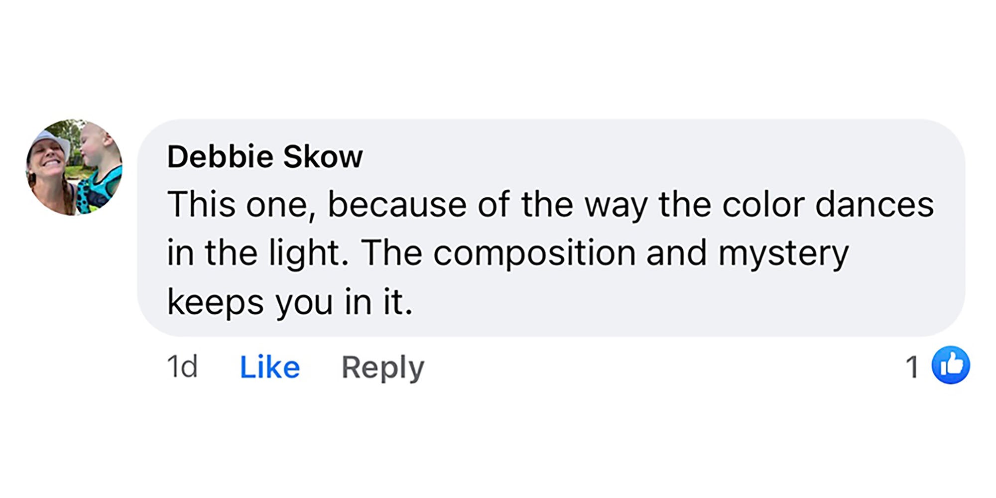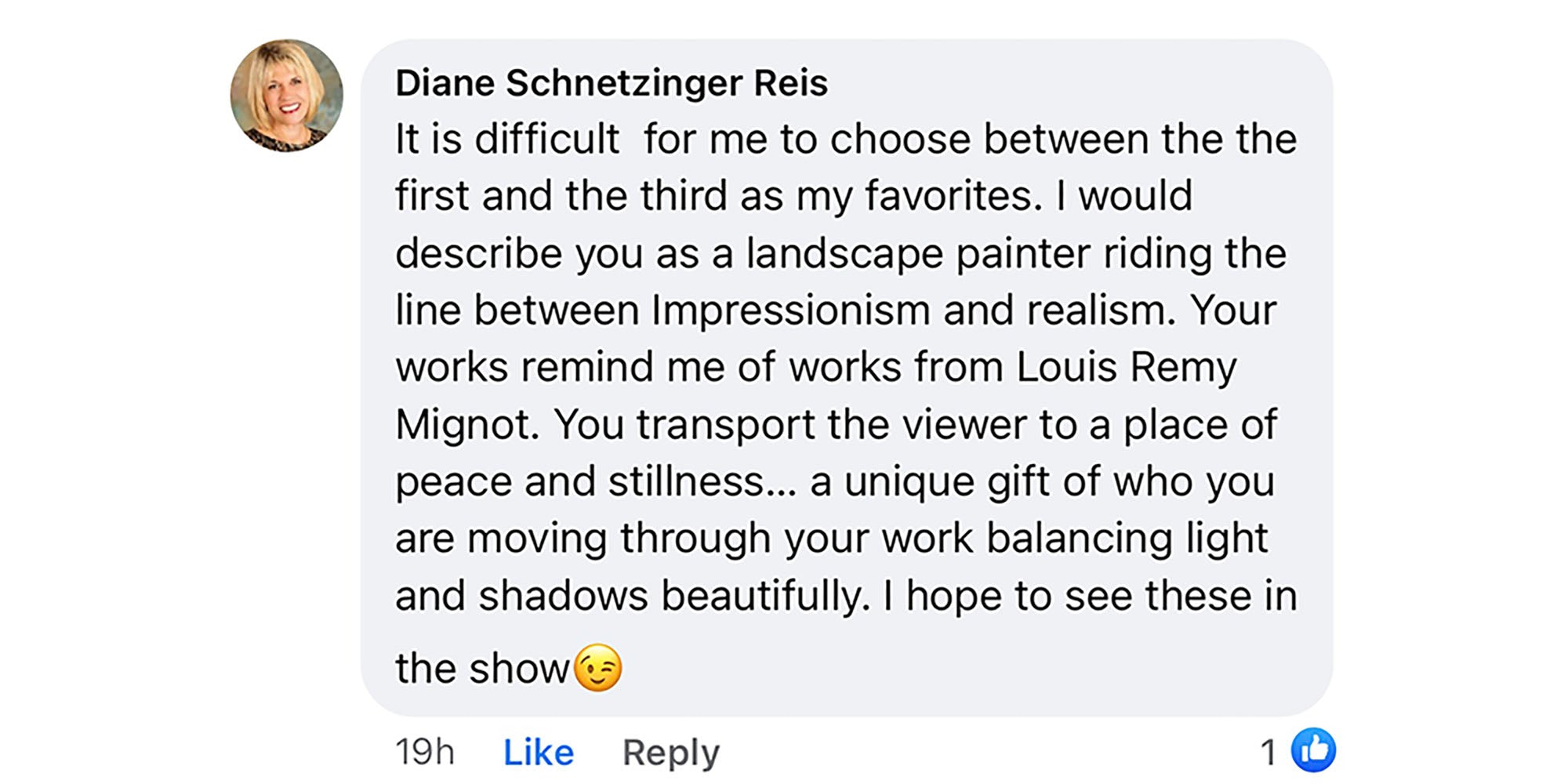 "The sun glowing through the trees on a trail through the woods. The light sparkling on the water of the lake or ocean. The sky filled with clouds and beautiful pastel colors and light. I paint with bold strokes to show confidence and stability in my work. These are the very reasons I became an artist."